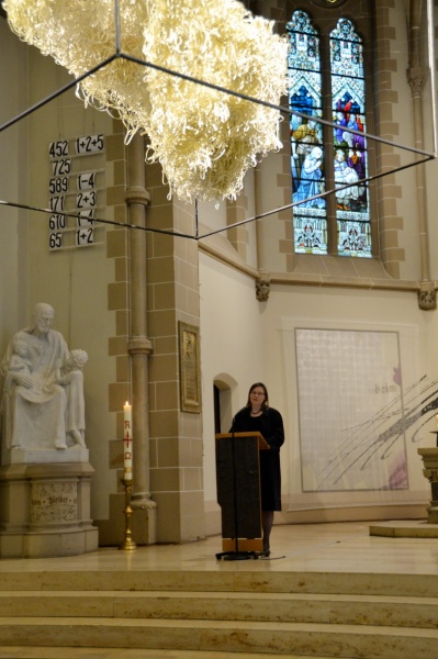 Die Künstlerin gestaltete Textobjekte und Papierskulpturen – filigrane Zeilen und Botschaften in einem neuen Sinnzusammenhang, verbunden mit der Architektur der Dankeskirche. Das Jubiläum der Thesen wurde durch die Künstlerin zum Jubiläum der Poesie: Worte im Raum.